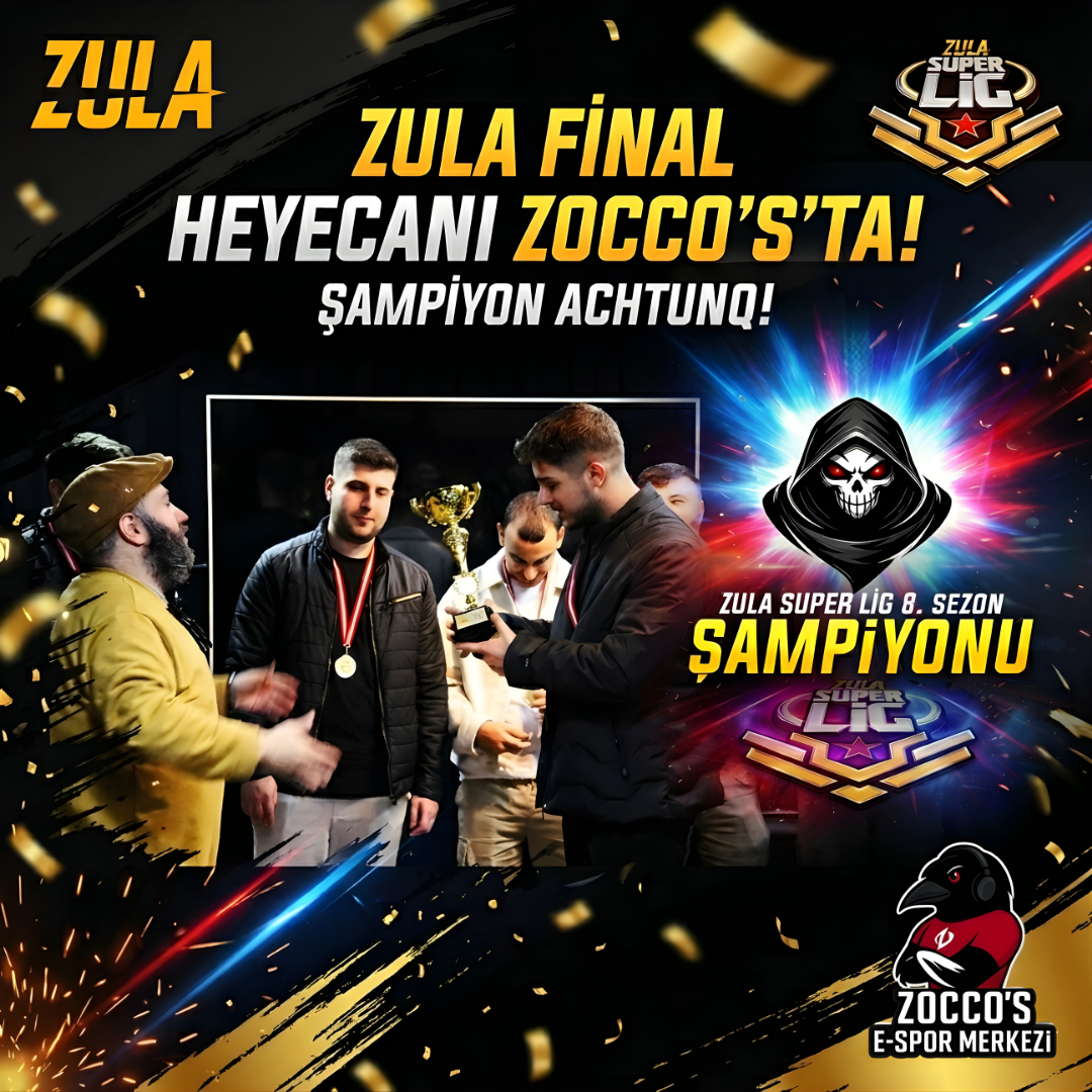 Türkiye’nin en rekabetçi espor organizasyonlarından biri olan Zula Süper Lig 8. Sezon finali, 28 Mart tarihinde Zocco’s Oyun Merkezi’nde büyük bir heyecanla takip edildi. 300.000 TL ödül havuzuna sahip olan bu dev final, hem izleyiciler hem de oyuncular için unutulmaz anlara sahne oldu.